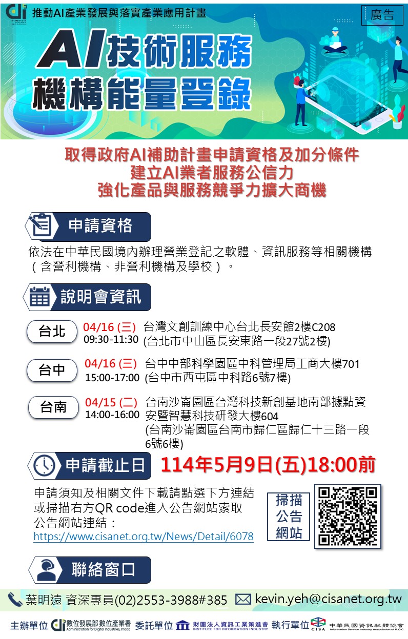 4/16(三)台北場-數位發展部數位產業署114年第一梯次人工智慧技術服務機構能量登錄申請說明會